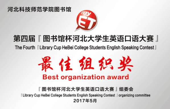 第四届“图书馆杯”河北省大学生英语口语大赛于2017年4月18日至5月8日举行,完美网页版图书馆荣获最佳组织奖。