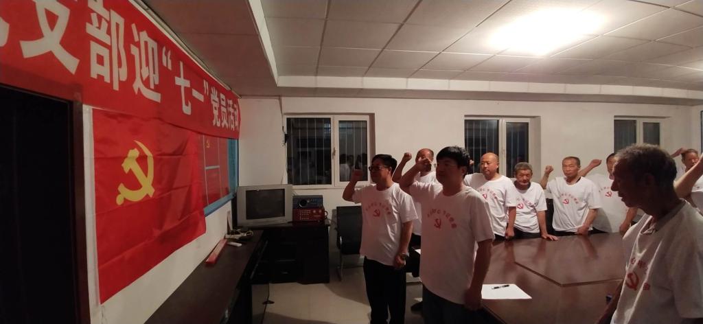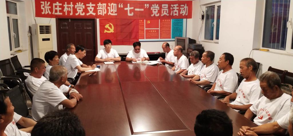 2019年6月30日,张庄村在村全体党员齐聚会议室,为迎“七一”党的生日,隆重举行重温入党誓词活动。面向鲜红的党旗,全体党员服装统一,郑重地举起右手宣誓。一声声铿锵有力的话语萦绕在耳畔,一张张朴实的面庞展现出激动的内心。重温入党誓词让全体党员再一次接受誓言的洗礼,让大家把“初心”和“使命”永记心间。