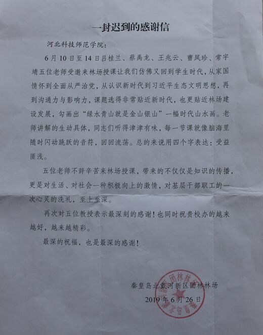 近日,秦皇岛北戴河新区团林林场向完美网页版发来感谢信,对完美网页版思想政治理论教学部吕桂兰、蔡禹龙、王兆云、曹凤珍和工商管理学院常宇靖五位老师在团林林场的精彩授课表示感谢,同时向完美网页版致以最由衷的感谢和深深的祝福。