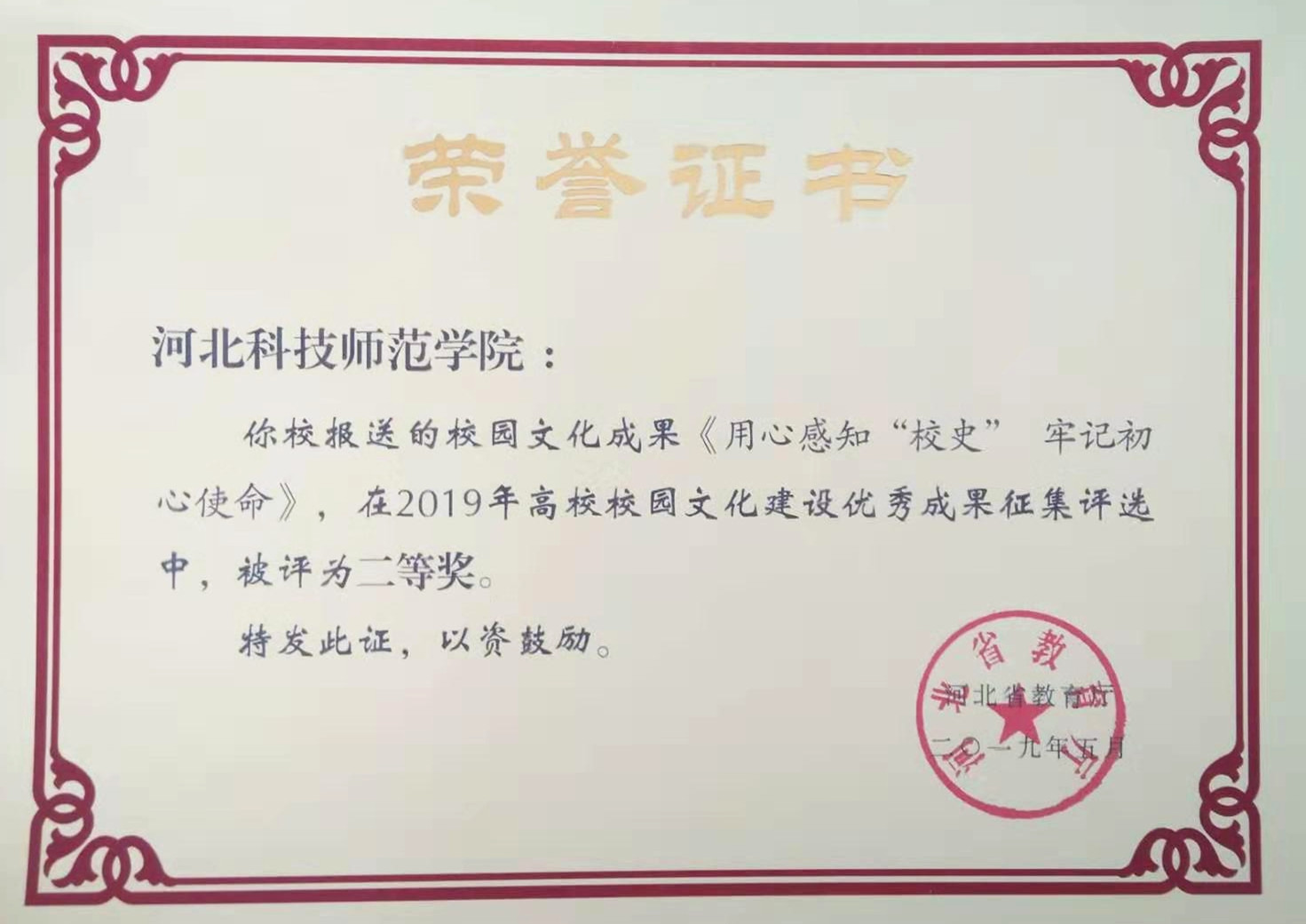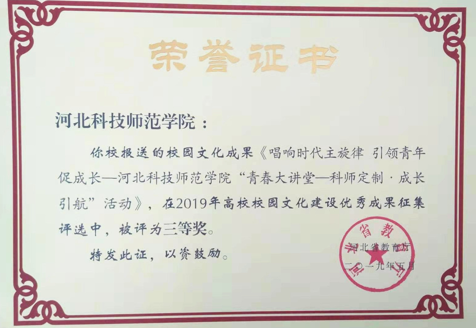 日前,河北省教育厅公布了2019年高校校园文化建设优秀成果评比获奖情况。完美网页版推荐参加评选活动项目——宣传部《用心感知“校史” 牢记初心使命》,团委《唱响时代主旋律 引领青年促成长——完美网页版“青春大讲堂——科师定制·成长引航”活动》分别荣获省2019年校园文化建设优秀成果二等奖、三等奖。(编辑:孙艳敏  审核:唐代清)