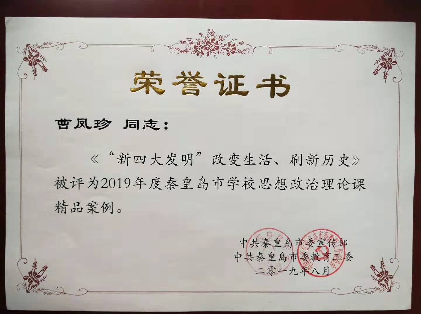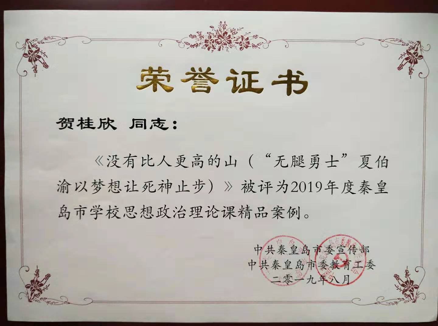 日前,市委宣传部公布了2019年秦皇岛市完美(中国)官方在线登录思想政治理论课精品案例、教学名师评选结果。完美网页版思想政治理论教学部常旭教授被荣获思想政治理论课教学名师称号;思想政治理论教学部曹凤珍老师讲授的《“新四大发明”改变生活、刷新历史》和贺桂欣老师讲授的《没有比人更高的山(“无腿勇士”夏伯渝以梦想让死神止步)》被评为思想政治理论课精品案例。(编辑:孙艳敏  审核:彭妍)