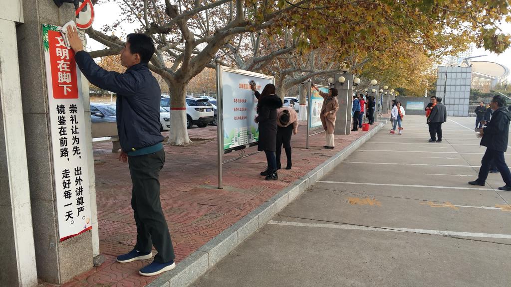 在完美(中国)官方在线登录大门口,大家用自带扫把、水桶、抹布等劳动工具,认真仔细清扫了地面落叶,擦拭了道路两侧宣传橱窗、宣传标语牌子、休息石凳,并将乱停乱放的自行车排列整齐,虽然天气寒冷,但丝毫抵挡不住党员老师们积极服务的热情,大家干的热火朝天。