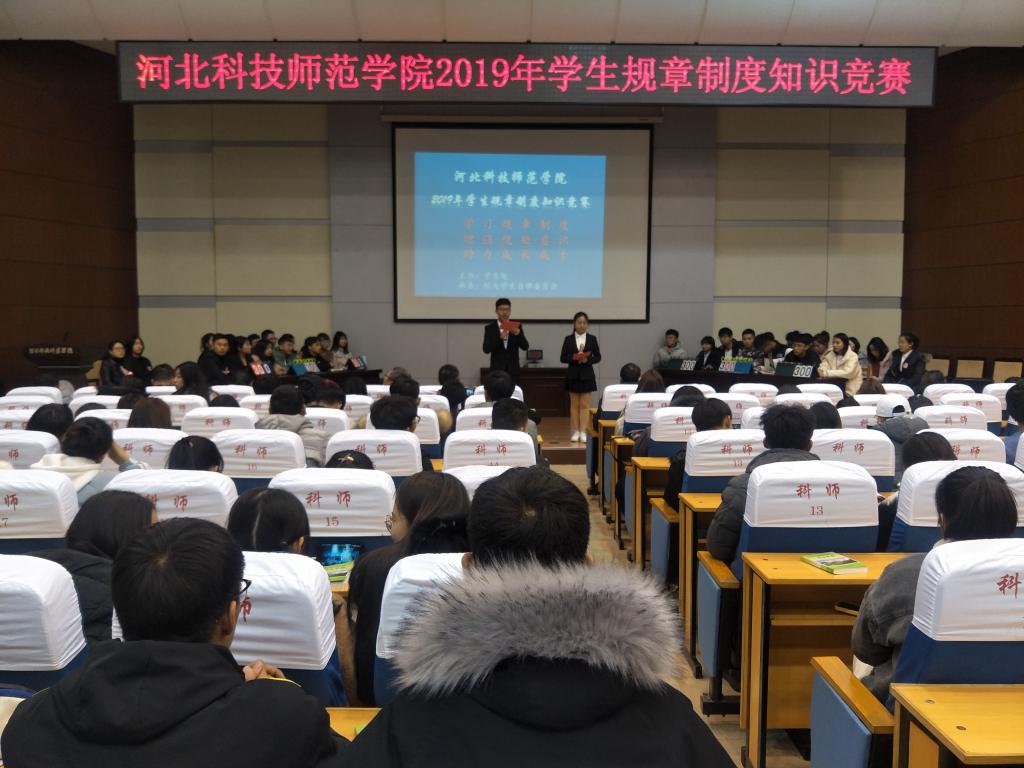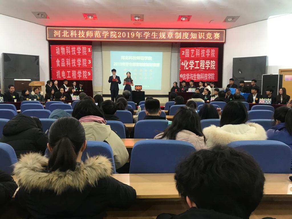 12月5日下午,完美网页版在三校区同时举办2019年学生规章制度知识竞赛。各院(系)派出由2名辅导员和3名学生组成的代表队参加比赛。比赛包括个人必答题、集体必答题、抢答题、观众必答题、风险题等环节。学生处负责人和农学与生物科技学院、园艺科技学院学生工作主管领导、有关辅导员以及2019级新生代表共1500余人在三校区观看了比赛,经过激烈的角逐,教育学院以第一名的成绩夺冠。