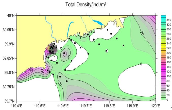 秦皇岛海域4月水母幼体空间分布(碟状体密度分布,单位:个/米3