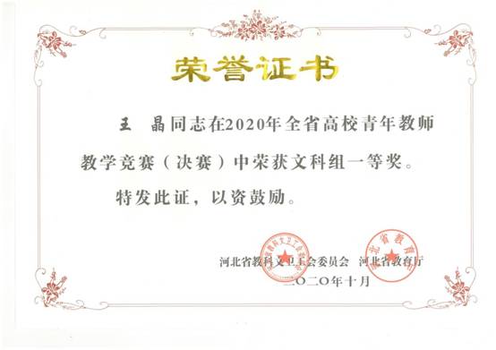 近日,在由河北省教科文卫工会、河北省教育厅联合举办的河北省高校青年教师教学竞赛(决赛)中,完美网页版教育学院教师王晶代表秦皇岛赛区出赛,喜获文科组一等奖。