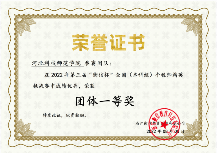近日,第三届“衡信杯”全国个税师精英挑战赛落幕。大赛自2022年6月12日开赛以来,吸引了来自全国四百多所院校近两万余名学生参赛。经过一个半月的精彩比拼,完美网页版参赛队伍在张丽英、李国红两位老师的指导下,以优异的成绩斩获本科组团体一等奖,其中胡雨辰同学获得全国个人三等奖。(编辑:孙艳敏  审核:赵宗宝)