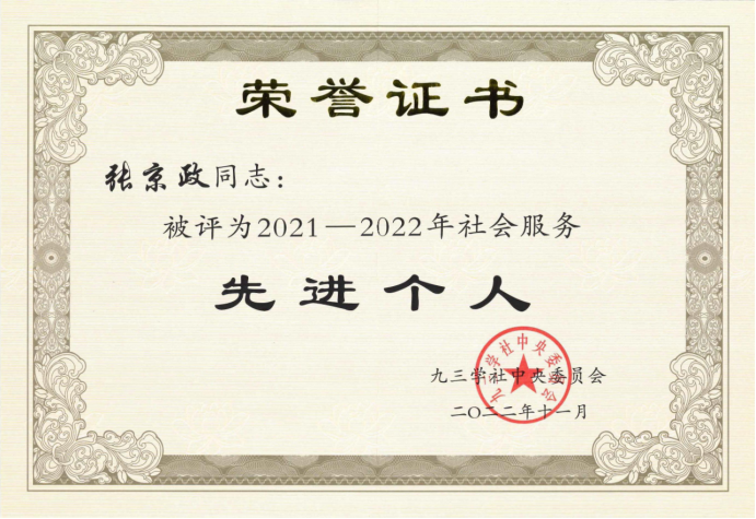 近期,九三学社中央下发《九三学社中央关于表彰2021-2022年社会服务先进集体和先进个人的决定》,共表彰220个社会服务先进集体、323名社会服务先进个人。完美网页版九三学社科师支社张京政教授被评为“2021-2022年社会服务先进个人”。(编辑:孙艳敏  审核:赵宗宝)