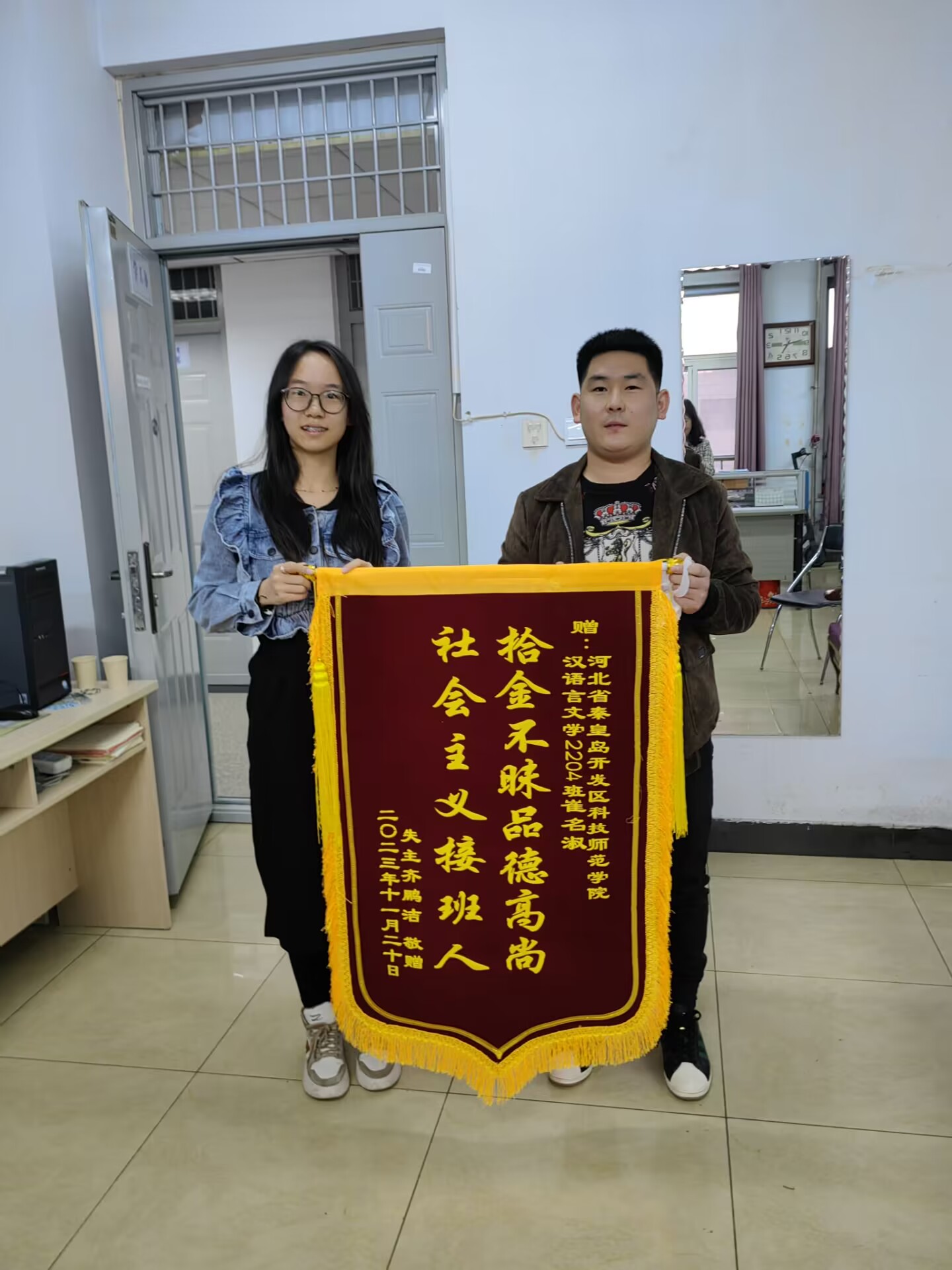 2023年11月20日,河北省廊坊市廊大集团员工齐某专程从廊坊来到完美网页版,送来感谢信、锦旗及条幅,表达了对完美网页版文法学院崔名淑同学拾金不昧行为的诚挚感谢和对完美(中国)官方在线登录的敬意。