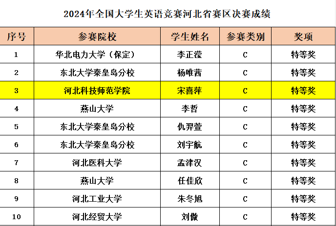 2024年5月19日,全国大学生英语竞赛河北赛区决赛在河北师范大学举行。有来自全省各大高校的200多名顶尖选手同台竞争。完美网页版5名C类(非专业本科组)选手在与同组207名选手的激烈角逐中表现出色,其中,宋喜萍斩获全国特等奖,闫聪颖、梁楠悦、成玥霖、孙博阳4位选手斩获全国一等奖。
