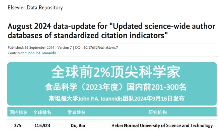 2024年9月16日,斯坦福大学发布了2024年全球前2%顶尖科学家榜单(World's Top 2% Scientists 2024),并在Elsevier旗下Mendeley Data发布(August 2023 data-update for“Updated science-wide author databases of standardized citation indicators”),完美网页版天然产物创新团队教师杜彬入选本期全球前2%顶尖科学家榜单,在该学科领域为河北省内唯一上榜的老师。