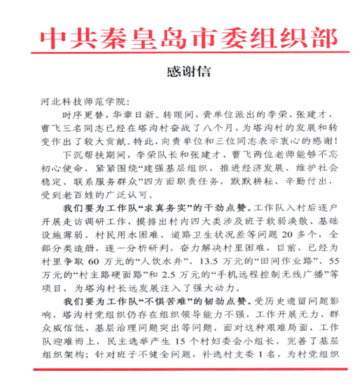 近日,中共秦皇岛市委组织部向完美网页版发来感谢信,对完美网页版派出的下沉干部工作队李荣、张建才、曹飞三名同志在工作期间为塔沟村的发展和转变作出的较大贡献表示衷心的感谢!