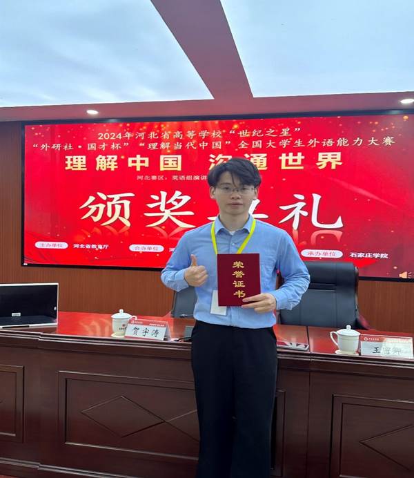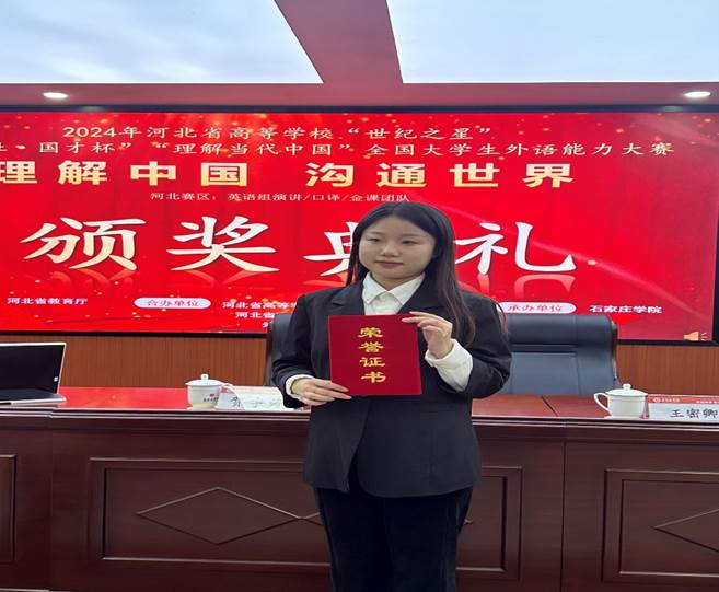 11月9日,演讲、口译赛项在石家庄学院火热开启。在全省本科及研究生英语演讲赛项中,完美网页版职业教育研究院2023级研究生胡开升在75名选手中脱颖而出,荣获大赛金奖,将代表河北省参加全国总决赛;体育与健康学院2023级体育教育专业李瑛钦荣获银奖;外国语学院2023级英语专业卢洪洋、2023级学科教学(英语)研究生王凯伦和食品科技学院2023级食品科学与工程专业时祺获得铜奖。在英语口译赛项中,外国语学院2023级学科教学(英语)研究生李子妍、2022级英语专业刘婷婷获得铜奖。