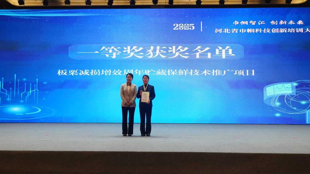 本次大赛聚焦女性科技人才创新活力激发与成果转化,采取“初赛选拔 + 决赛路演答辩”机制,邀请省科协智库专家从创新性、社会价值、团队能力等维度综合评审。赵玉华团队研发的核心技术以机械冷库调湿贮藏为核心,攻克了板栗长期保存失水霉烂、生虫退糖等行业难题,实现贮藏 12 个月好果率超 98% 的突破。该技术已通过国家发明专利认证(专利号:ZL 201410840872.9),并在宽城、青龙等燕山板栗主产区规模化应用。