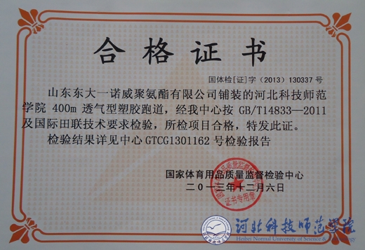 昌黎校区体育场施工工程包括场地平整、排水沟砌筑、沥青砼基础、球场草皮铺设、田径场塑胶铺设、运动场照明灯具配电及安装、升旗台等施工内容。该项目委托国家体育用品质量监督检验中心进行了专项检测,11项检测指标全部合格,中心出具了检验报告和合格证书。经过验收小组仔细核查,逐项验收,认定该施工项目合格。(编辑:孙艳敏   审稿:赵建平)