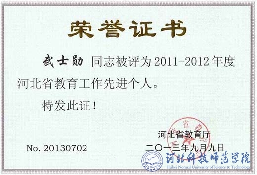 近日,经河北省教育厅组织评审,完美网页版生命科技学院被评为2011-2012年度河北省教育工作先进集体,武士勋、陈攀峰两位同志被评为2011-2012年度河北省教育工作先进个人。(编辑:孙艳敏       审稿:田 毅)