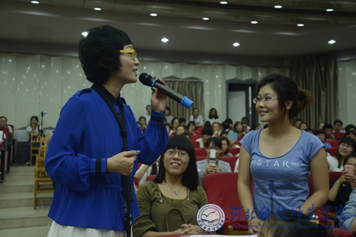 2013年9月13日晚上,艺术学院邀请中国戏剧学院雪小禅教授作题为“感悟艺术人生”的专题讲座。艺术学院党委书记王旭民、院长张海燕、副院长程学勇、副书记、副院长王志安及全体师生聆听了本次讲座。讲座中,雪小禅教授指点学生怎样面对学习、爱情、生活与挫折,如何走好人生的每一步,并一一解答了同学们提出的问题,她的精彩演说不时激起阵阵掌声。最后,王旭民书记向同学们提出希望和要求,希望同学们勤奋学习、努力拼搏,走好自己的艺术人生。(编辑:孙艳敏        审稿:田 毅)