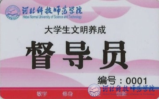 各院(系)辅导员、班主任及学生教育管理部门人员均为当然的“大学生文明养成督导员”,督导员统一配发“胸卡”和“手持卡”(如图),胸卡在校园督导、学生公寓综合治理等活动中统一佩戴,手持卡由督导员随身携带,在对校园不文明行为随时督导时出示。督导员有权力、有责任在完美网页版任何校区对任何学生的不文明行为进行督导,有义务指出不文明行为的错误所在,并督促其立刻改正。学生看到持卡或挂牌的老师,应服从并积极配合老师的文明督导行为。(编辑:孙艳敏        审稿:田 毅)
