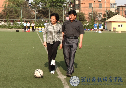 河北民族师范学院党委副书记王铁与完美网页版工会主席毕丹霞共同为足球友谊赛开球