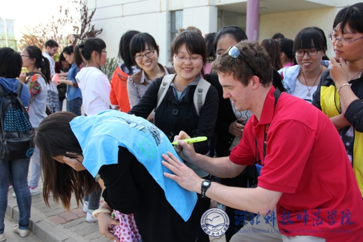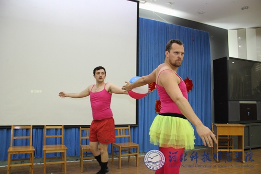 精心准备的12节课堂教学,惠及外国语学院16个班级。学生们不仅切实感受到了西方本土教学方式与中式教学方式的差别,也学到了很多国内课本上、课堂上没有的知识。课堂互动频繁,轻松幽默而又不失严谨;三场讲座,既有针对学生克服迷茫,战胜挫败的心理和实战措施,又有面向师范类师生教育教学的方法与技巧;三场歌舞及幽默剧的表演,让所有现场观看的师生捧腹,而大笑过后,更多地是钦佩这些志愿者教师的敬业和认真精神,并为之感染;五次英语角活动,惠及全校师生,地道的英语发音,真实的语言场景,加上自由与面对面的沟通,极大地调动了全校学生学习英语的热情和积极性。