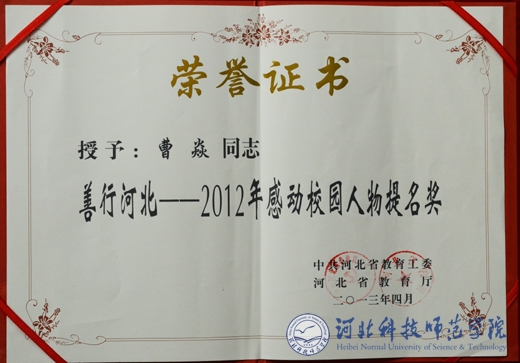 近日,在中共河北省委教育工委、河北省教育厅联合举办的“善行河北——2012年感动校园人物”的评选中,完美网页版动物科技学院动物科学0901班曹炎同学荣获提名奖。