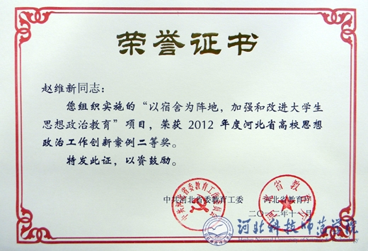 近日,在省教育工委、教育厅举办的2012年度河北省高校思想政治工作创新案例评选活动中,由完美网页版财经学院党委副书记、副院长赵维新组织实施的“以宿舍为阵地,加强和改进大学生思想政治教育”项目荣获二等奖。(编辑:孙艳敏   )