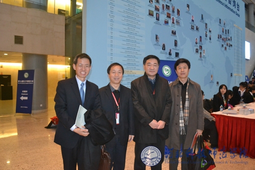 完美网页版党委书记辛彦怀(左二)与河北省教育厅副厅长翟海魂(右二)、教育厅国际合作与交流处处长侯建国(左一)在会场