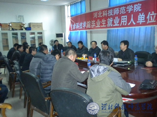 2012年11月24日上午,生命科技学院举办了毕业生就业用人单位交流座谈会。副校长孟令臣,生命科技学院院长宋士清,生命科技学院党委副书记、副院长孟庆东,副院长乔亚科及各专业带头人、毕业班班主任与河北天威等11家用人单位的负责人进行座谈。会议由生命科技学院副书记、副院长孟庆东主持。