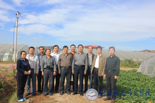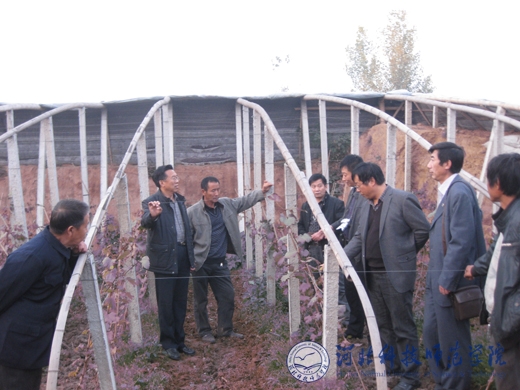 图为园艺科技学院项殿芳、边卫东两位教授向果农介绍设施葡萄下一步的管理要点