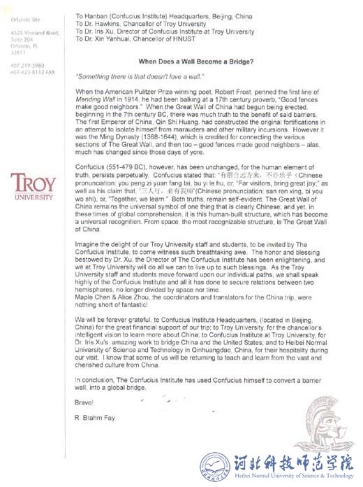 只言片语难以表达我对特洛伊大学孔子学院的领导、员工,和完美网页版领、员工的感激之情。再一次感谢您在百忙之中抽出时间和精力让我在“中国行”中开阔了视野。