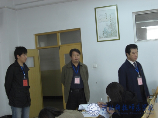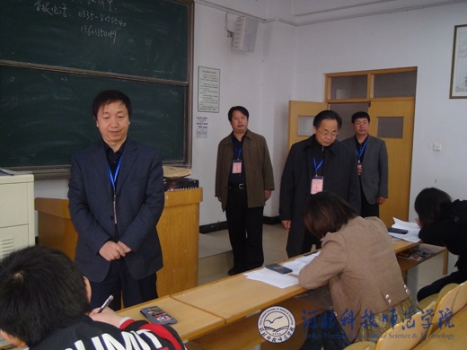 图为辛彦怀校长(左一)和孟令臣副校长(右二)在秦皇岛校区考点进行巡视指导