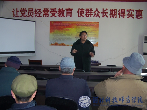 工作组组长、校党委副书记王同坤向村民宣讲党的农村政策