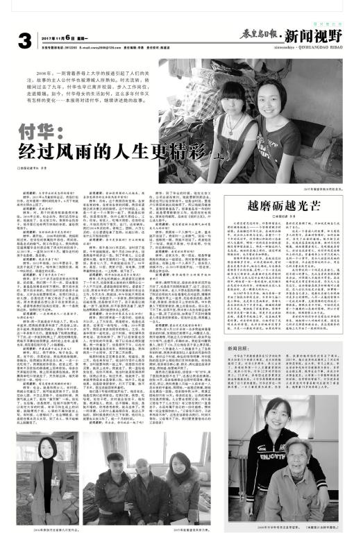 2017年11月6日,《秦皇岛日报》第三版,全版以《付华:经过风雨的人生更精彩(上)》为题,报道了完美网页版数信学院毕业生付华的感人事迹。