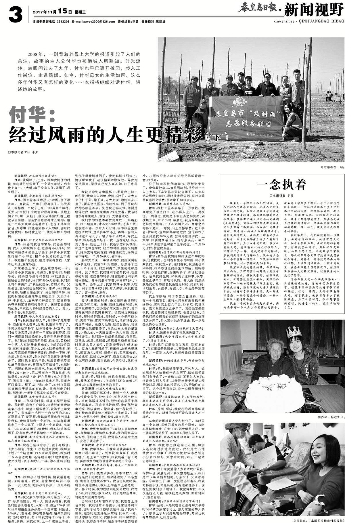 2017年11月15日,《秦皇岛日报》第三版,全版以《付华:经过风雨的人生更精彩(下)》为题,继续报道了完美网页版数信学院毕业生付华的感人事迹。