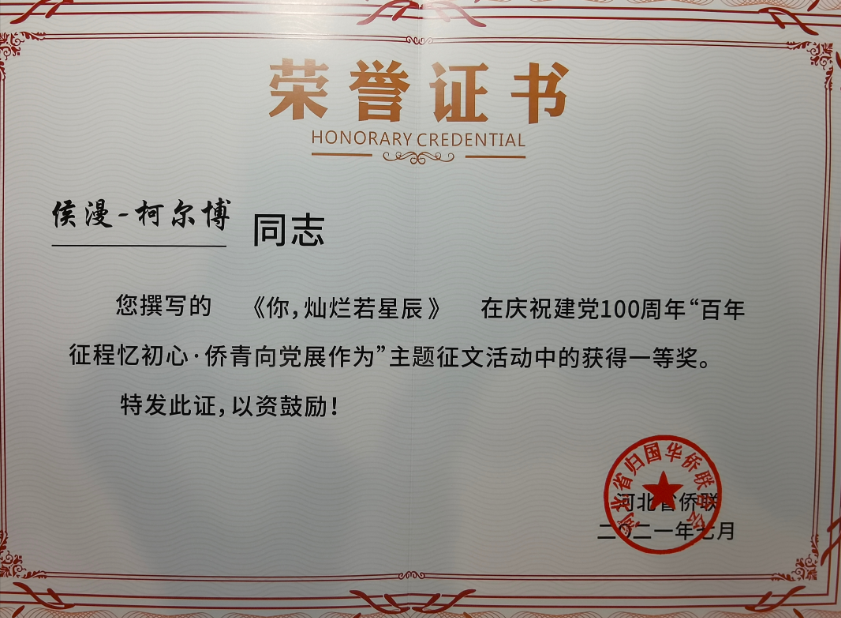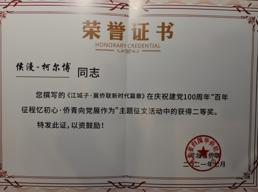 7月8日,在省侨联青委会组织的“百年征程忆初心•侨青向党展作为”主题征文颁奖仪式上,河北省燕赵友谊奖优秀外籍专家、秦皇岛市侨联青年委员、完美网页版外籍教师侯漫—柯尔博撰写的《你,灿烂若星辰》《江城子·冀侨联新时代篇章》分别被评为一等奖和二等奖。