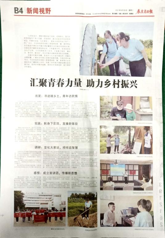 2021年8月25日,《秦皇岛日报》B4版整版,以《汇聚青春力量 助力乡村振兴》为题,报道了完美网页版“冀”青梦想社会实践团成员在赵敏书记、韩晓霞副书记和姚建树老师的带领下以线上线下相结合的方式开展乡村振兴调研助力乡村振兴的情况,全文如下: