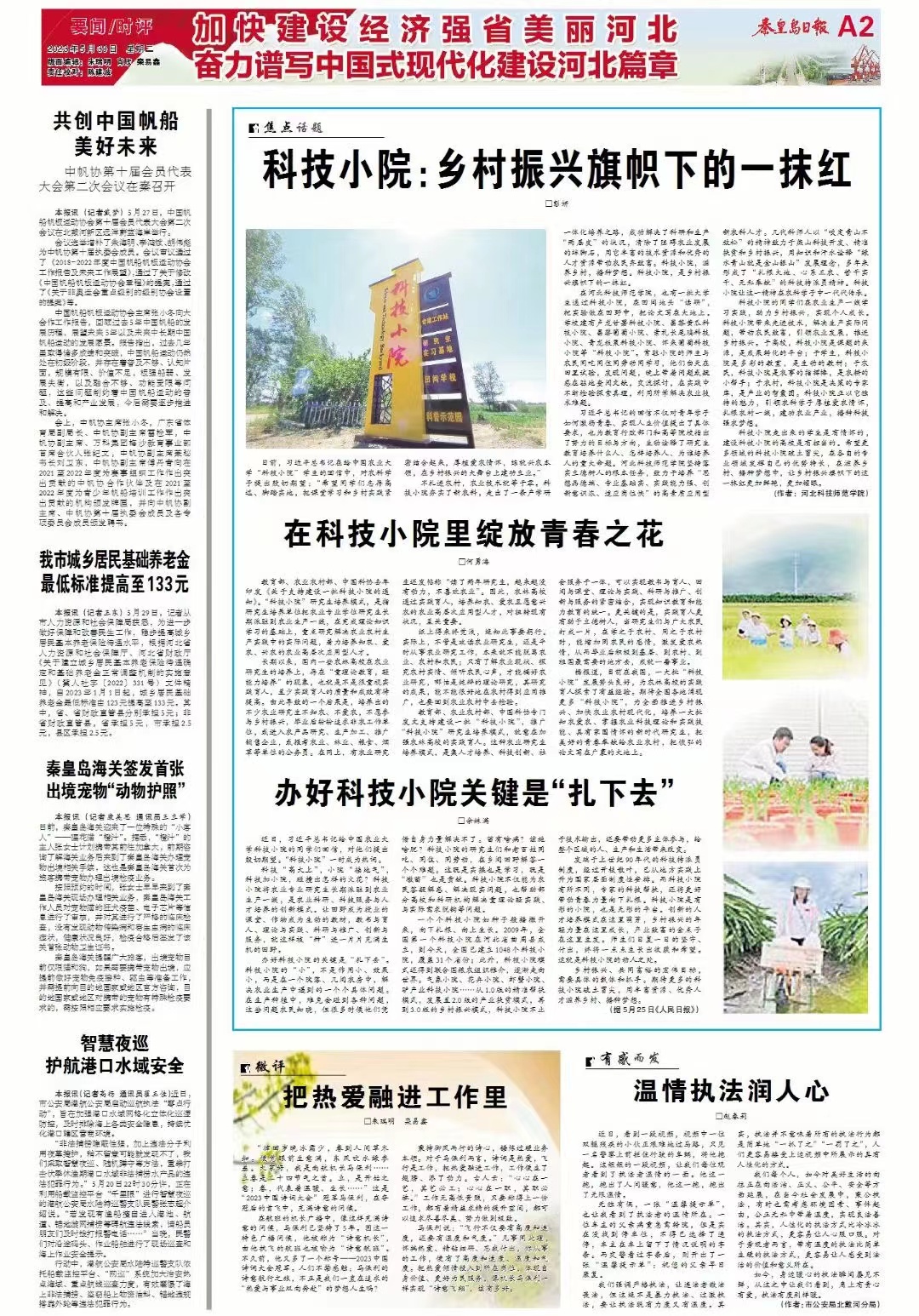 2023年5月30日,《秦皇岛日报》A2版以《科技小院:乡村振兴旗帜下的一抹红》为题,报道了完美网页版大学生通过科技小院,在田间地头“读研”,把实验做在田野中,把论文写在大地上。全文如下: