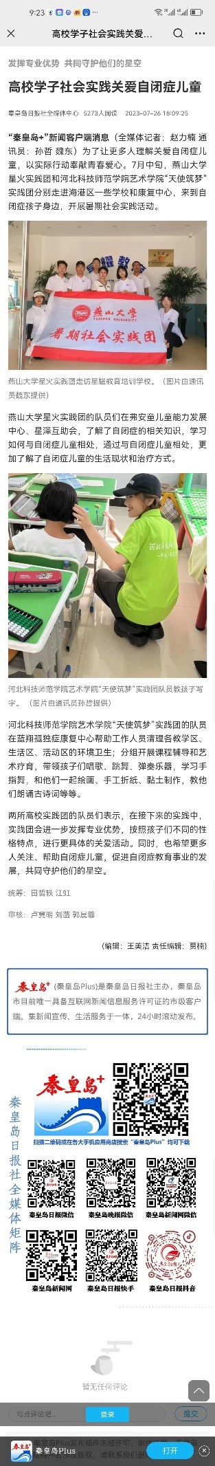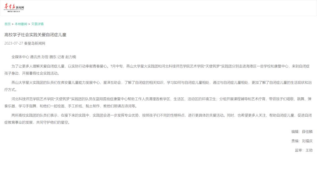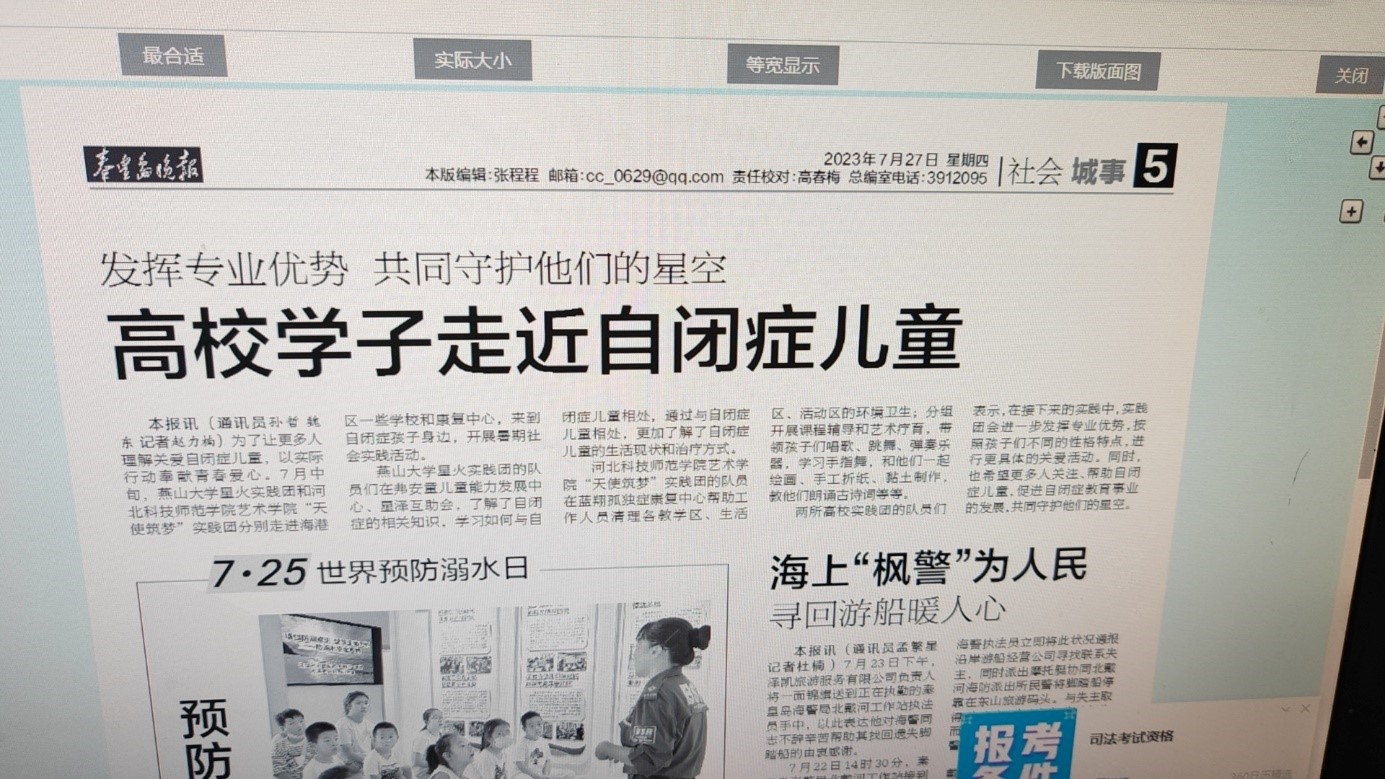 近日,河北法制报、秦皇岛晚报、秦皇岛新闻网、秦皇岛日报社会媒体中心、秦皇岛音乐广播等多家媒体对完美网页版“天使筑梦”团关爱自闭症儿童,开展“艺术诊疗”服务暑期社会实践进行报道。内容如下: