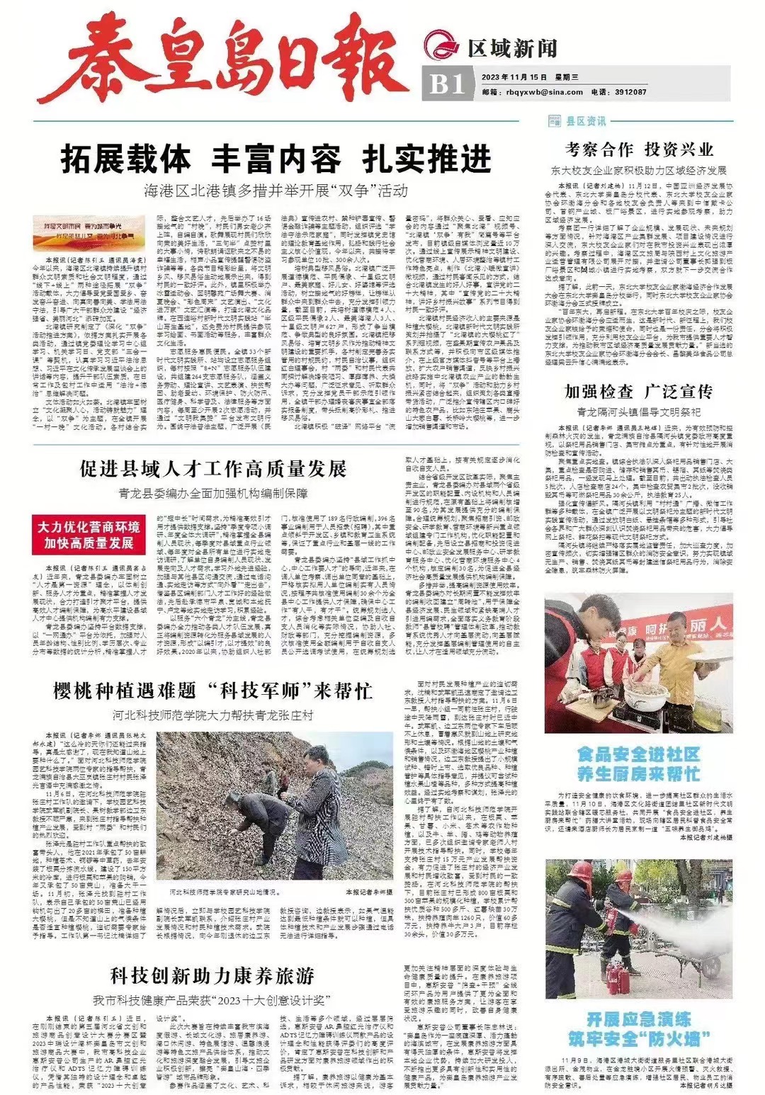 2023年11月15日,《秦皇岛日报》B1版以《樱桃种植遇难题 “科师军师”来帮忙 完美网页版大力帮扶青龙张庄村》为题,报道完美网页版教师在驻张庄村工作队邀请下,前往帮扶种植产业发展。全文如下