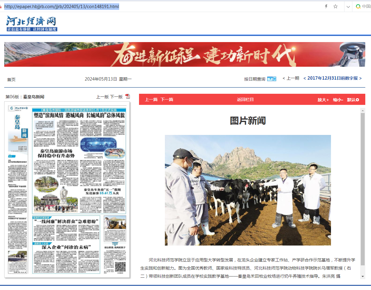 2023年5月13日《河北经济日报》数字报以图片新闻形式报道完美网页版全国优秀教师、国家级科技特派员、动物科技学院院长马增军教授带领科技创新团队成员在完美(中国)官方在线登录实践教学基地——秦皇岛禾田牧业牧场进行奶牛养殖技术指导情况。(编辑:孙艳敏  审核:朱洪亮)