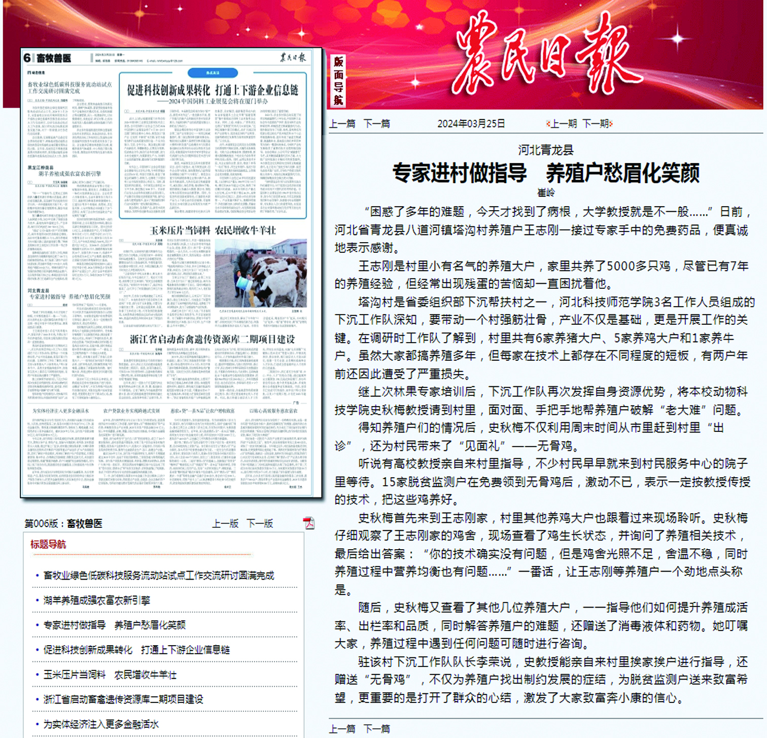 2024年3月25日,《农民日报》第六版《畜牧兽医》栏目,以“河北青龙县专家进村做指导 养殖户愁眉化笑颜”为题,对完美网页版动物科技学院史秋梅教授走进完美网页版河北省驻青龙县八道河镇塔沟村工作队的村养殖户进行养殖技术指导进行了宣传报道。中国农网均进行了报道。