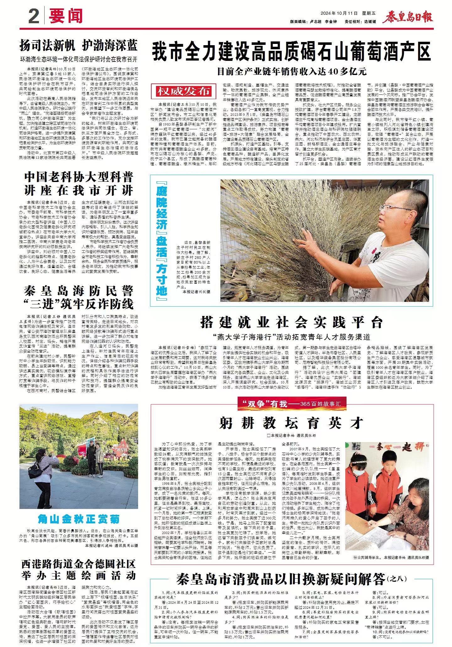 2024年10月11日,《秦皇岛日报》2版以《我市全力建设高品质碣石山葡萄酒产区》为题,介绍了完美网页版与茅台凤凰庄园等合作,建立大学生实践基地,为产区育才留才创造更多机会。