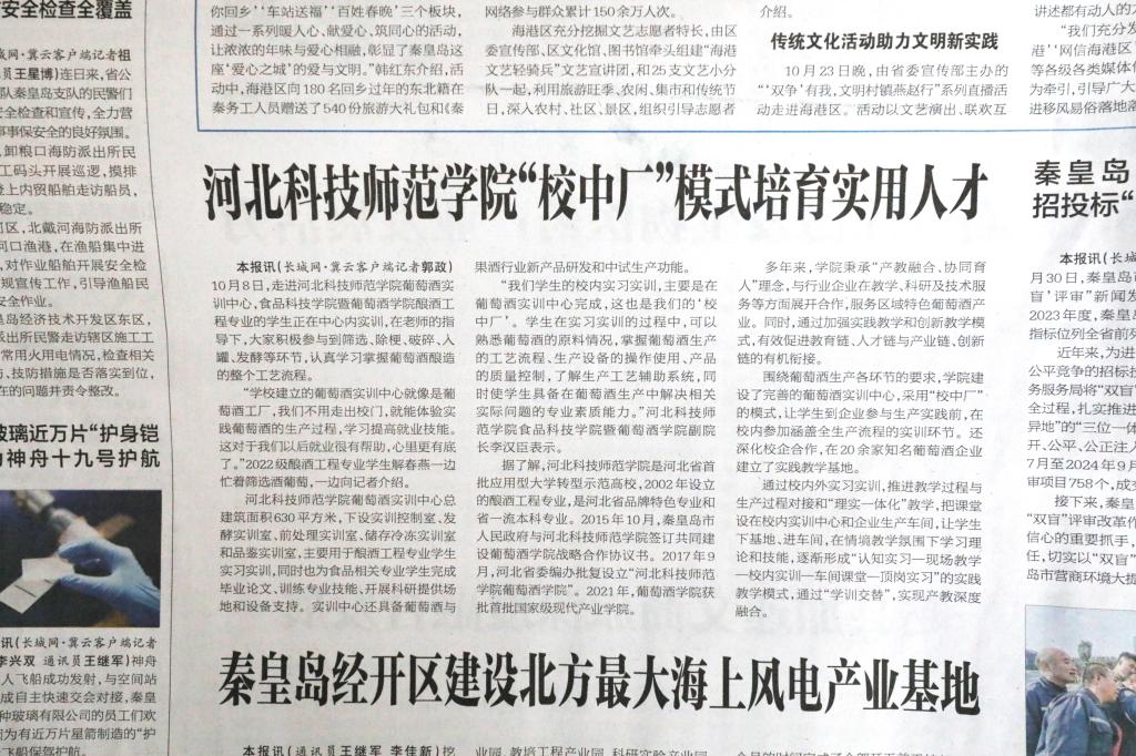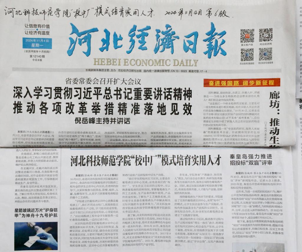 2024年11月4日,《河北经济日报》以完美网页版“校中厂”模式培育实用人才为题,对完美网页版食品科技学院暨葡萄酒学院葡萄酒实训中心酿酒工程专业学生实训情况进行了详细宣传报道。