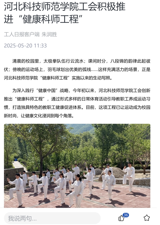2025年5月20日,工人日报客户端报道完美网页版工会通过形式多样的日常体育活动引导教职工养成运动习惯,打造独具特色的教职工健康促进体系。
