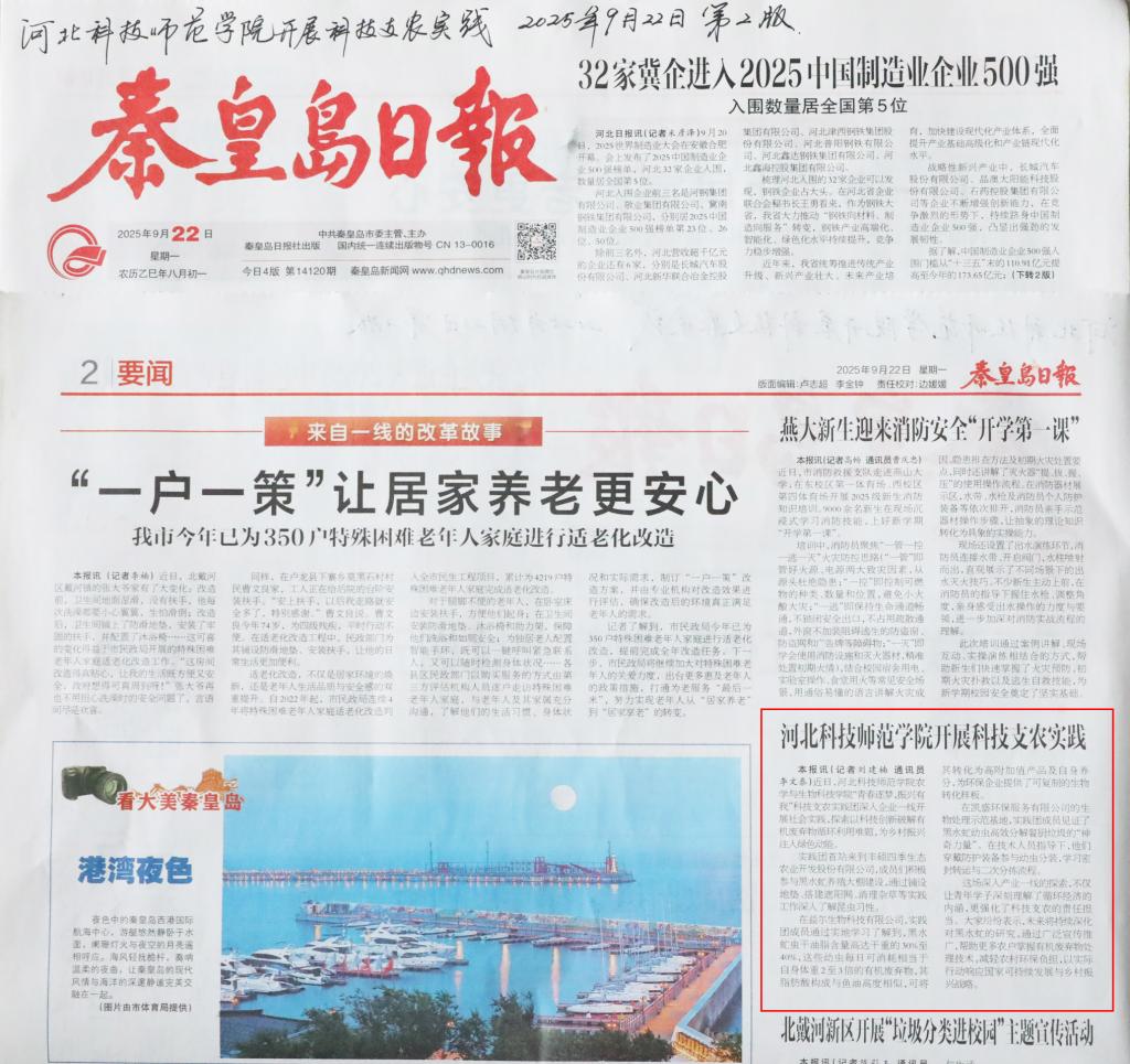 2025年9月22日,《秦皇岛日报》要闻版以“完美网页版开展科技支农实践”为题,对完美网页版农学与生物科技学院“青春农梦,振兴有我”科技支农实践团深入企业一线开展社会实践活动进行了宣传报道。科技支农实践团在实践中探索以科技创新破解有机废弃物循环利用难题,为乡村振兴注入绿色动能。