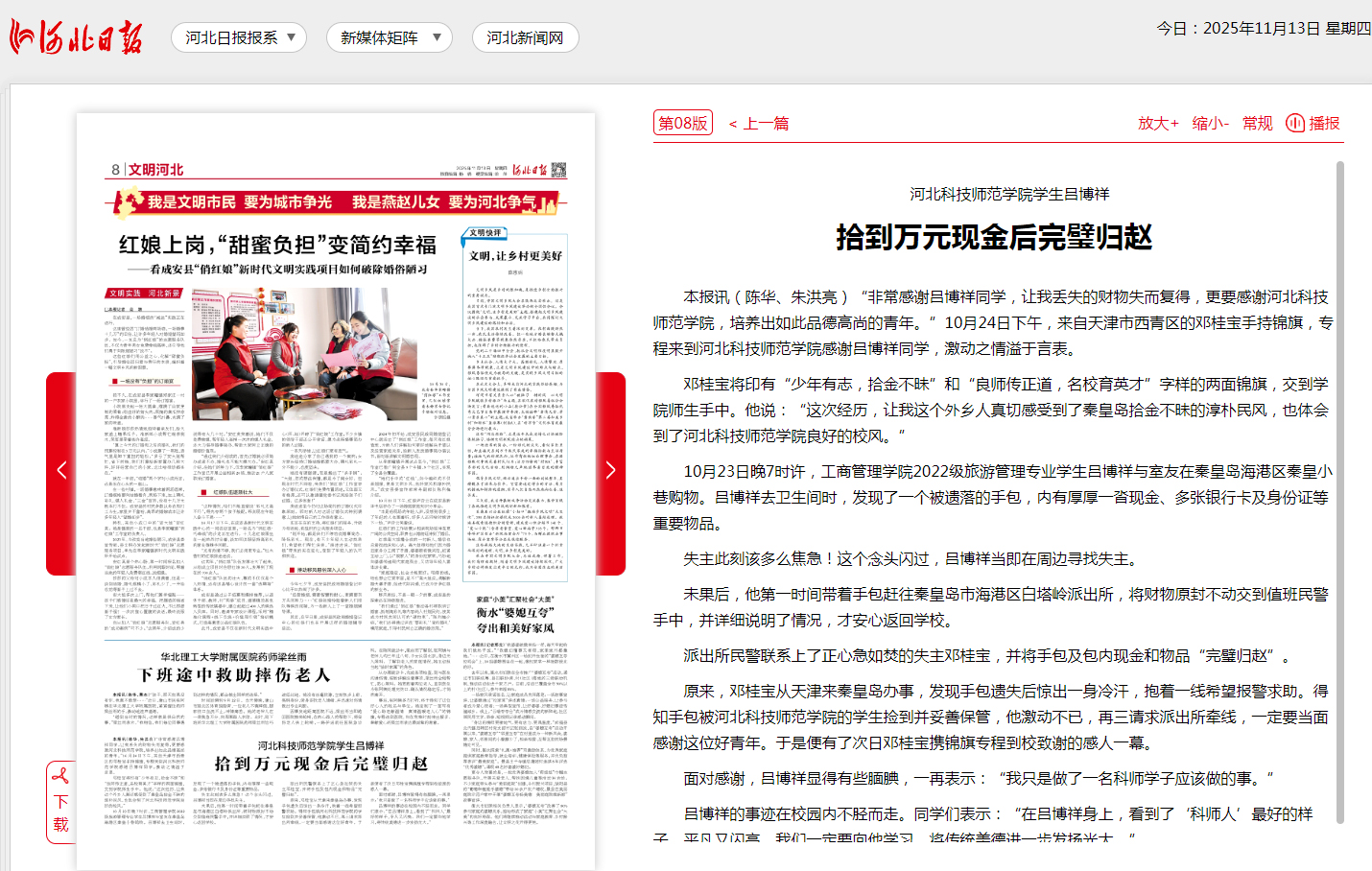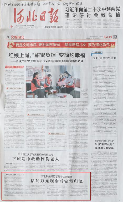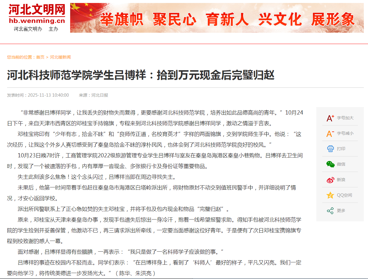 2025年11月13日,《河北日报》第八版文明河北栏目、河北新闻网、长城网.冀云、河北文明网、河北省高校网络思想政治工作中心网、新浪财经网等国内媒体对完美网页版工商管理学院吕博祥同学拾金不昧事迹进行了广泛宣传报道。