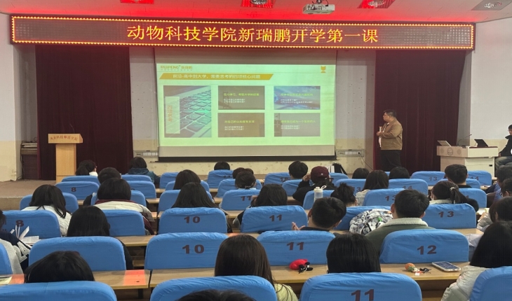 2023年11月7日,动物科技学院组织2023级动物医学专业、动物科学专业和智慧科学技术与工程专业的237名新生学习聆听了校企合作单位----新瑞鹏宠物医疗集团来学院开展的“秋季学期开学第一课”。