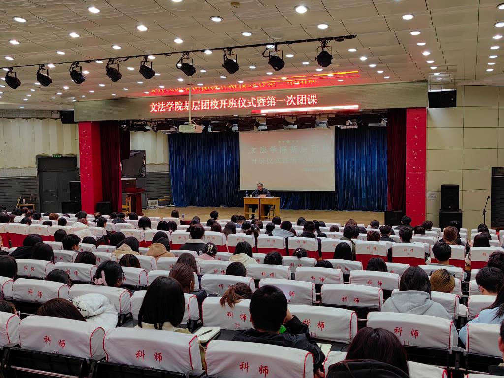 为提高广大青年学生的思想理论水平和政治素质,增强安全意识,2023年11月10日,文法学院团委在综合楼二楼报告厅开展基层团校开班仪式暨第一次团课。