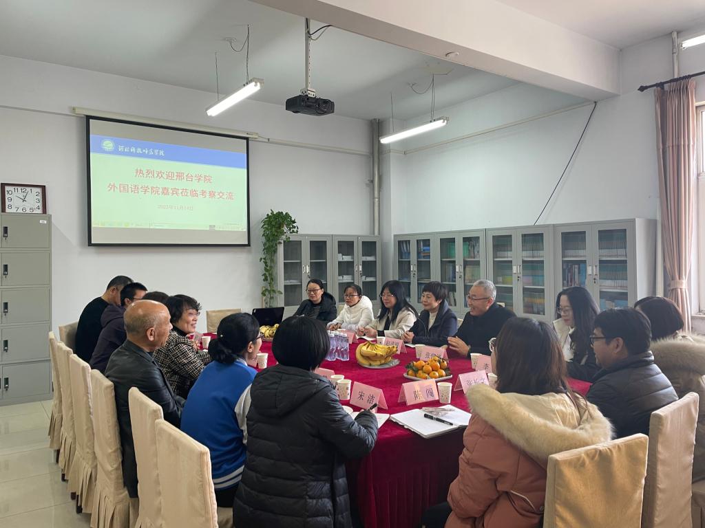 11月14日,邢台学院外国语学院副院长赵清丽、副书记张恒泽一行7人来完美网页版外国语学院考察交流。外国语学院有关领导,英语教学部、公共英语教学部、学工办老师参加座谈。