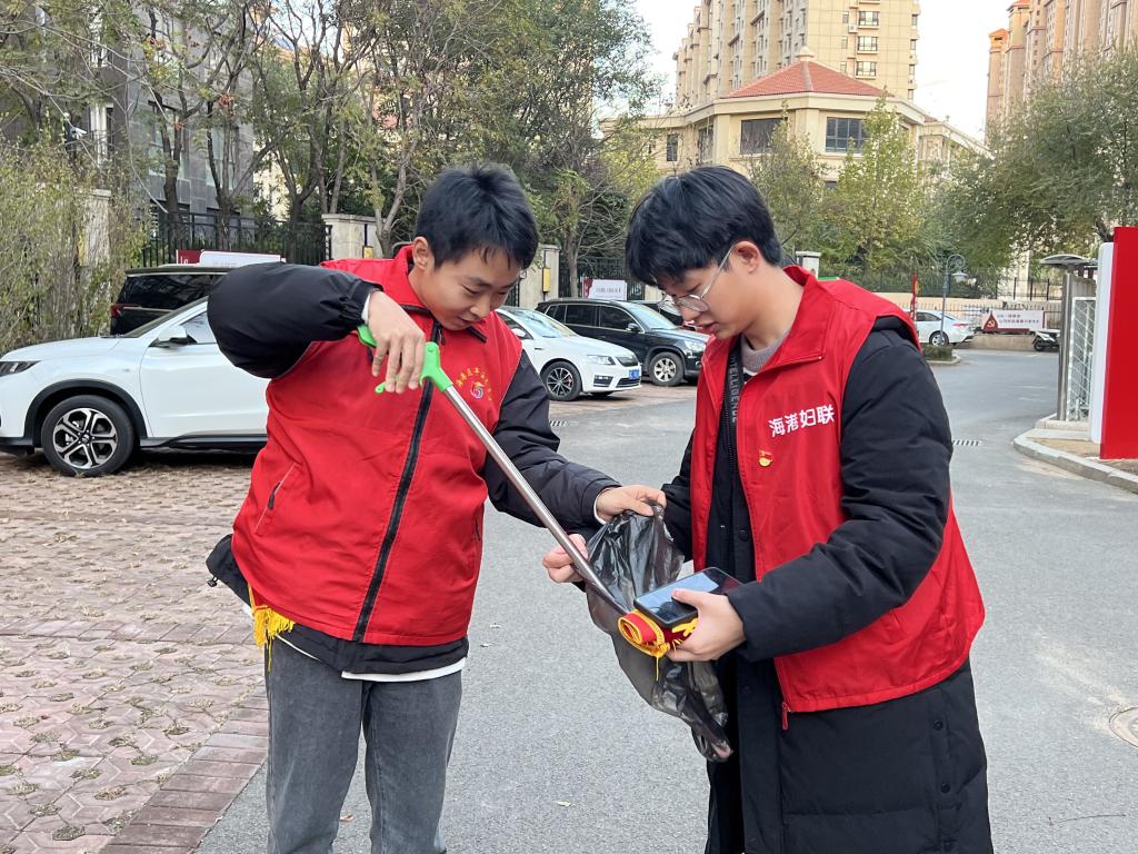 大学生志愿者认真清理社区公共区域垃圾