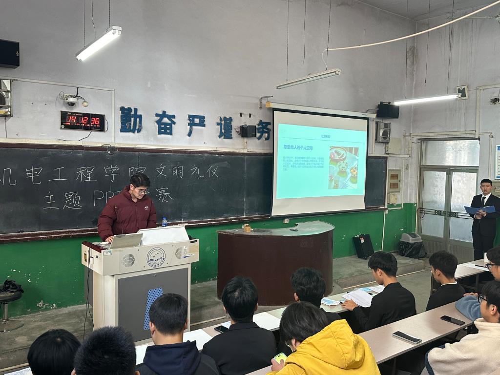 为了丰富大学生的课余生活,提高大学生文明礼仪素养,2023年11月19日,机电工程学院在昌黎校区举办文明礼仪素养PPT大赛,学院大一、大二各专业同学积极参加了活动。